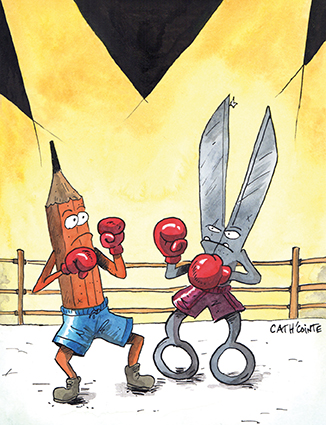 Deux dessin pour l’exposition « Au bout du crayon : liberté d’expression et censure. » Merci à L’association Le Crayon, partenaire de l’événement Libérons les crayons ! qui a inauguré l’exposition à Toulouse le 8 janvier 2024.