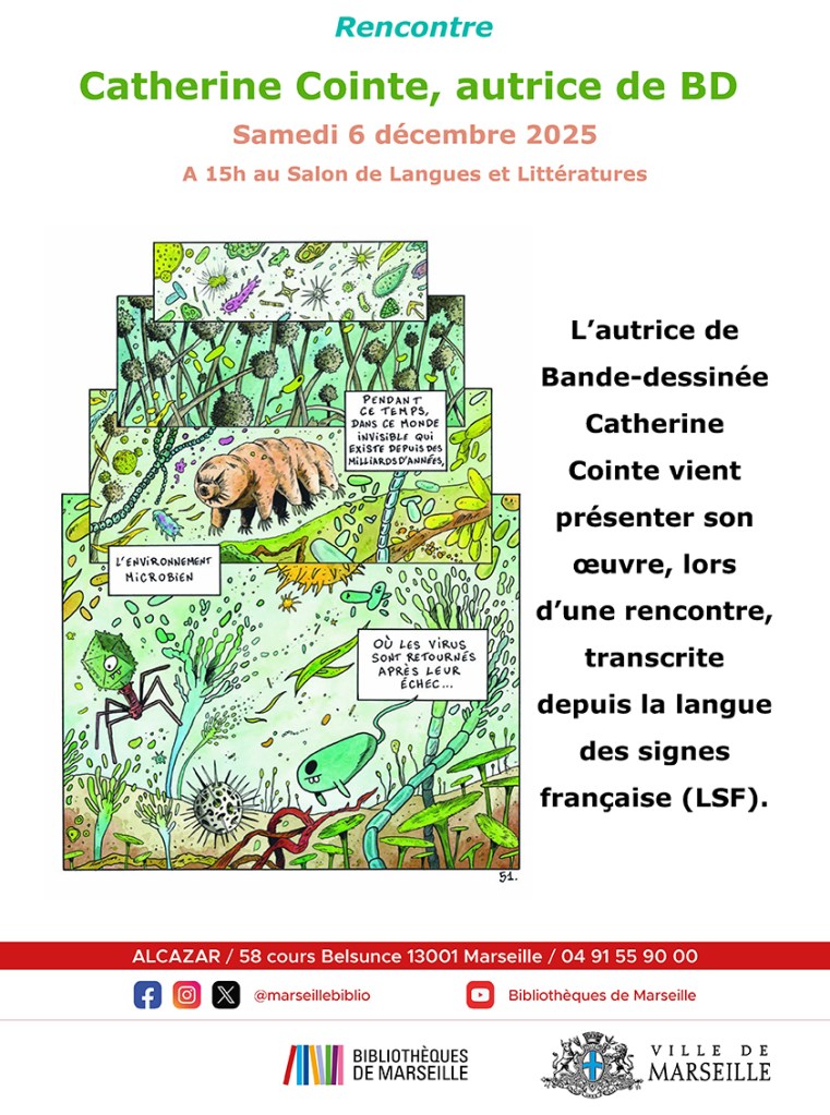 Retrouvez quelques-unes de mes planches de mon album BD« Le variant ultime » et de « L’incroyable histoire de Michel Corindon » publiée dans le numéro 2 du fanzine « Drones & Gabians » dans l’exposition qui a commencé le 3 décembre 2025 et se termine le 2 janvier 2026, à la bibliothèque de l’Alcazar, à Marseille !