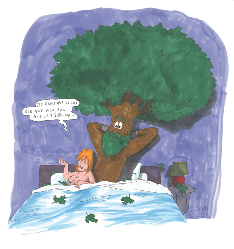 Le sirop d’érable avec un dessin d’un érable barbu et musclé comme un bûcheron canadien et son feuillage tout rouge à l’automne…