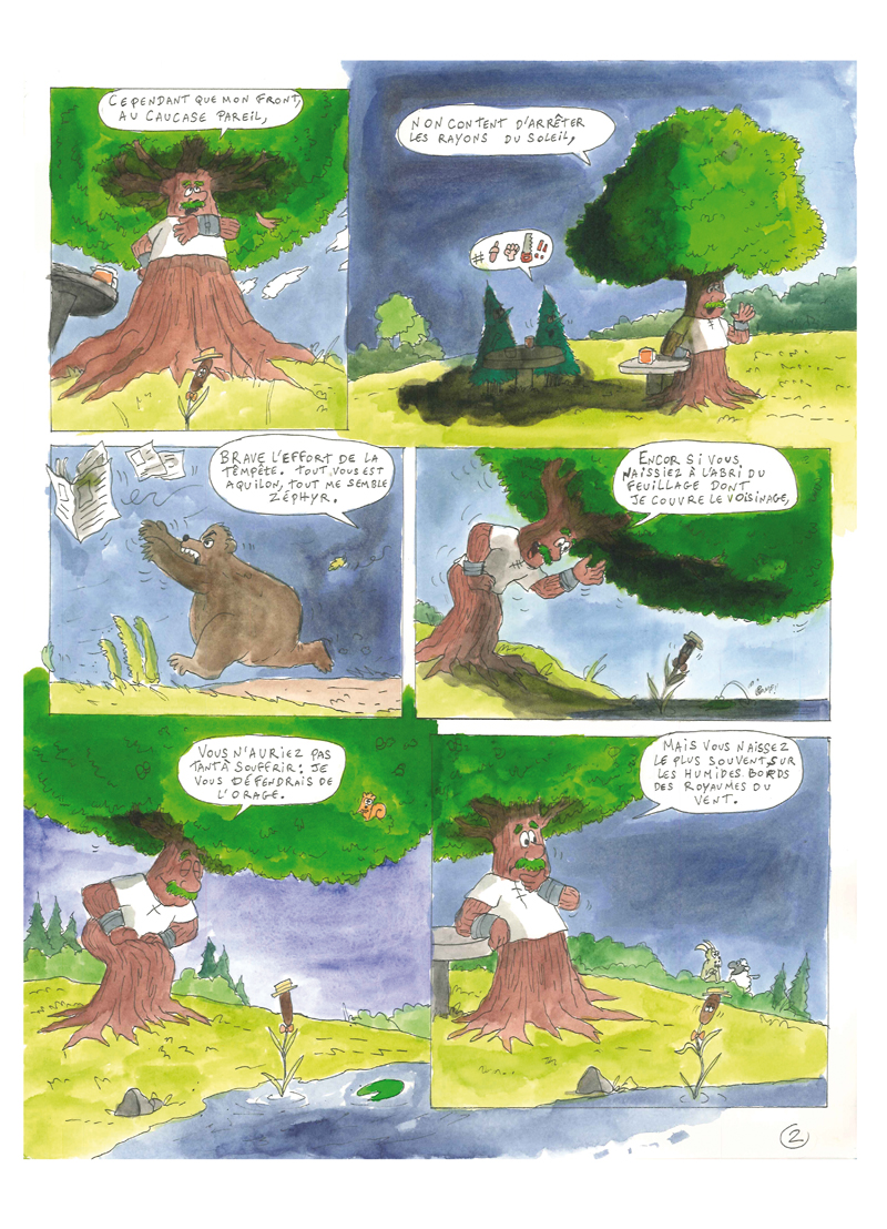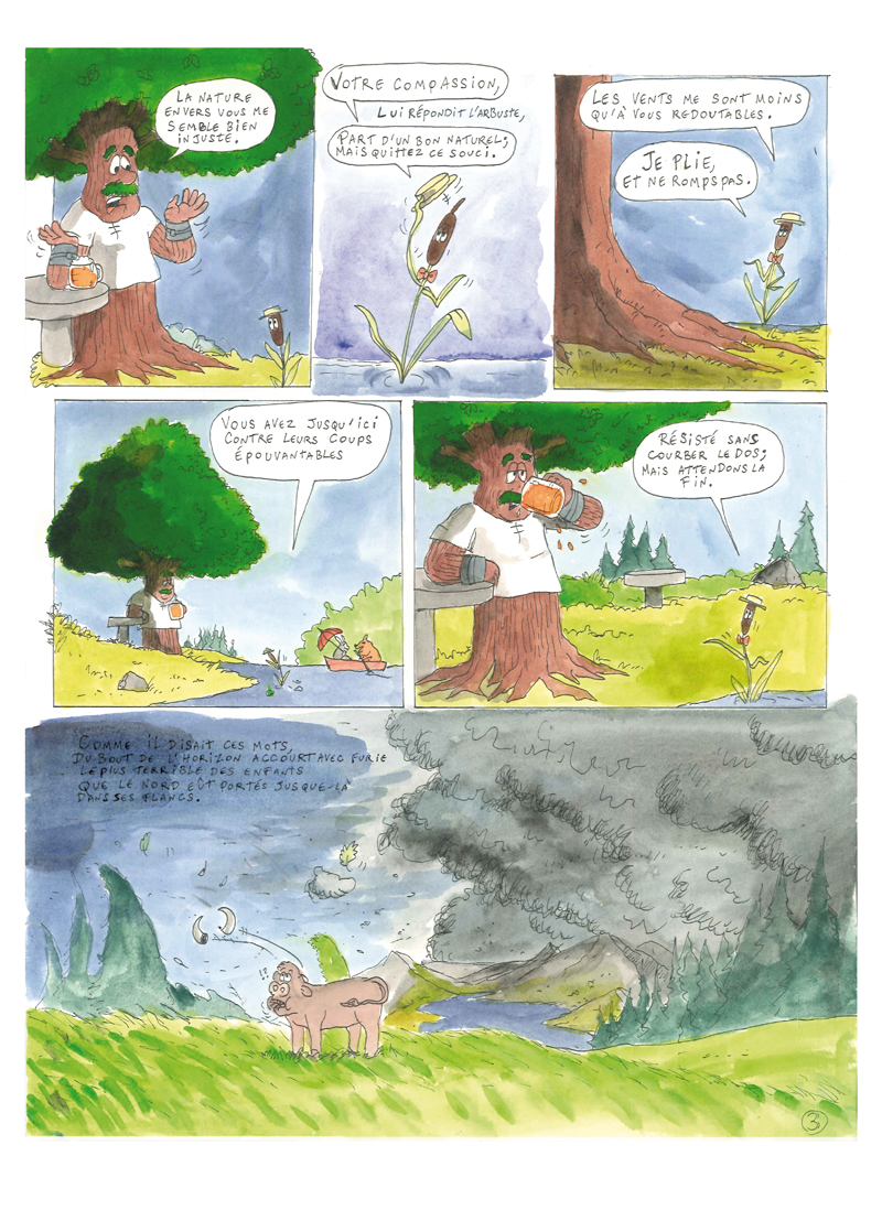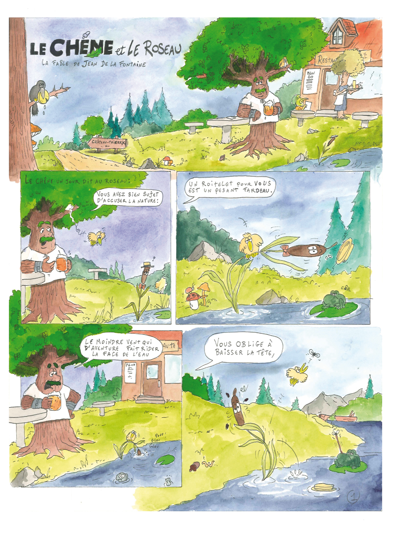 Comme je suis amatrice des fables de la Fontaine, j’ai fait une BD « le Chêne et le Roseau », l’une de mes fables préférées…