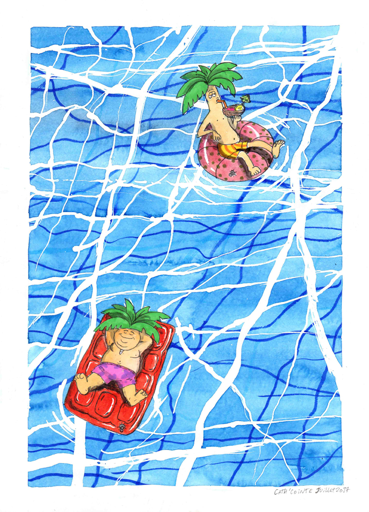 Alors, j’avais vu l’expo sur David Hockney, au musée Pompidou, il y a un an, donc j’ai dessiné un piscine avec les palmiers..